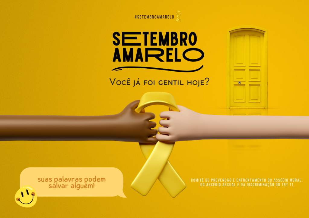 Imprimir Campanha faz alusão ao Setembro Amarelo Imagem sobre a campanha ”Você já foi gentil hoje” realizada pelo TRT-11 em prol do Setembro Amarelo 20/09/2024 – Setembro é um mês dedicado à conscientização sobre a saúde mental, conhecido como Setembro Amarelo, uma campanha que visa prevenir o suicídio e promover a valorização da vida, sensibilizando a […]