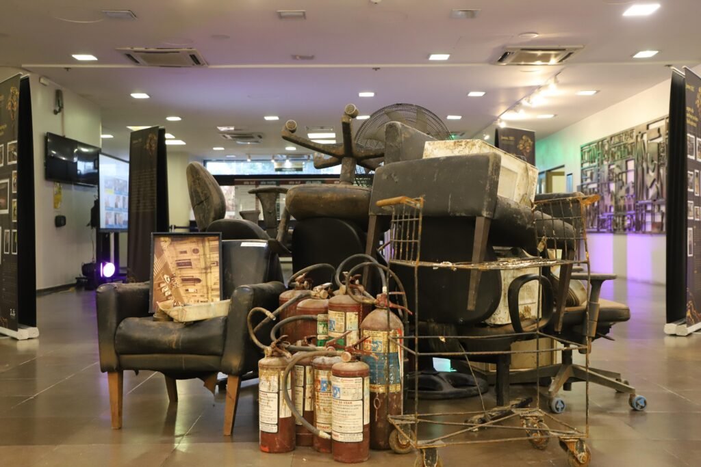 Imprimir A mostra é composta por móveis e objetos das unidades da Justiça do Trabalho atingidas pelas inundações, o barco utilizado durante os resgates, além de blocos temáticos com textos sobre os acontecimentos da enchente Fotografia de objetos em uma exposição, voltado à exposição sobre os impactos da enchente, no TRT-RS 10/09/2024 – A exposição “Juntos, […]