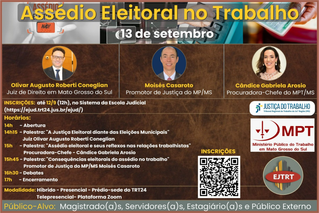 Imprimir Um dos temas é assédio eleitoral e seus reflexos nas relações trabalhistas Imagem que traz informações completas do Evento sobre o Assédio Eleitoral no Trabalho no TRT-24 (MS) 09/09/2024 – O Tribunal Regional do Trabalho da 24ª Região (TRT/MS) e o Ministério Público do Trabalho (MPT/MS), com o apoio da Escola Judicial do TRT/MS, realizam […]
