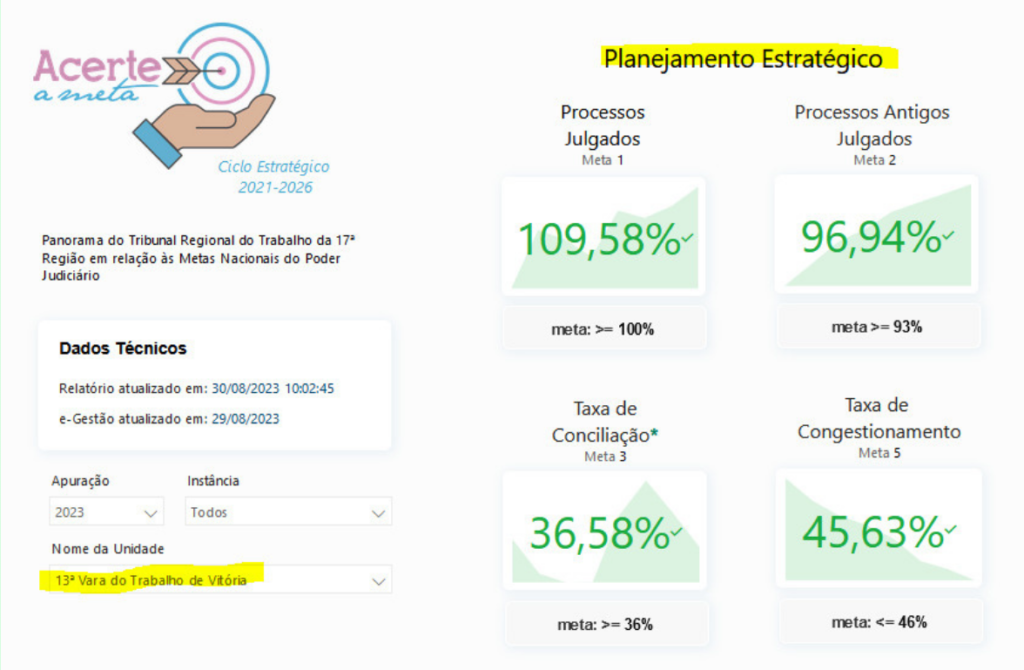Resultados foram divulgados no fim do mês passado Na imagem, metas alcançadas pelo TRT-17 12/09/2023 – Faltando ainda quatro meses para encerrar o ano, a 13ª Vara do Trabalho de Vitória (ES) já tem motivos para comemorar. Os dados do Acerte a Meta extraídos em agosto revelam o cumprimento das quatro metas definidas pelo CNJ […]