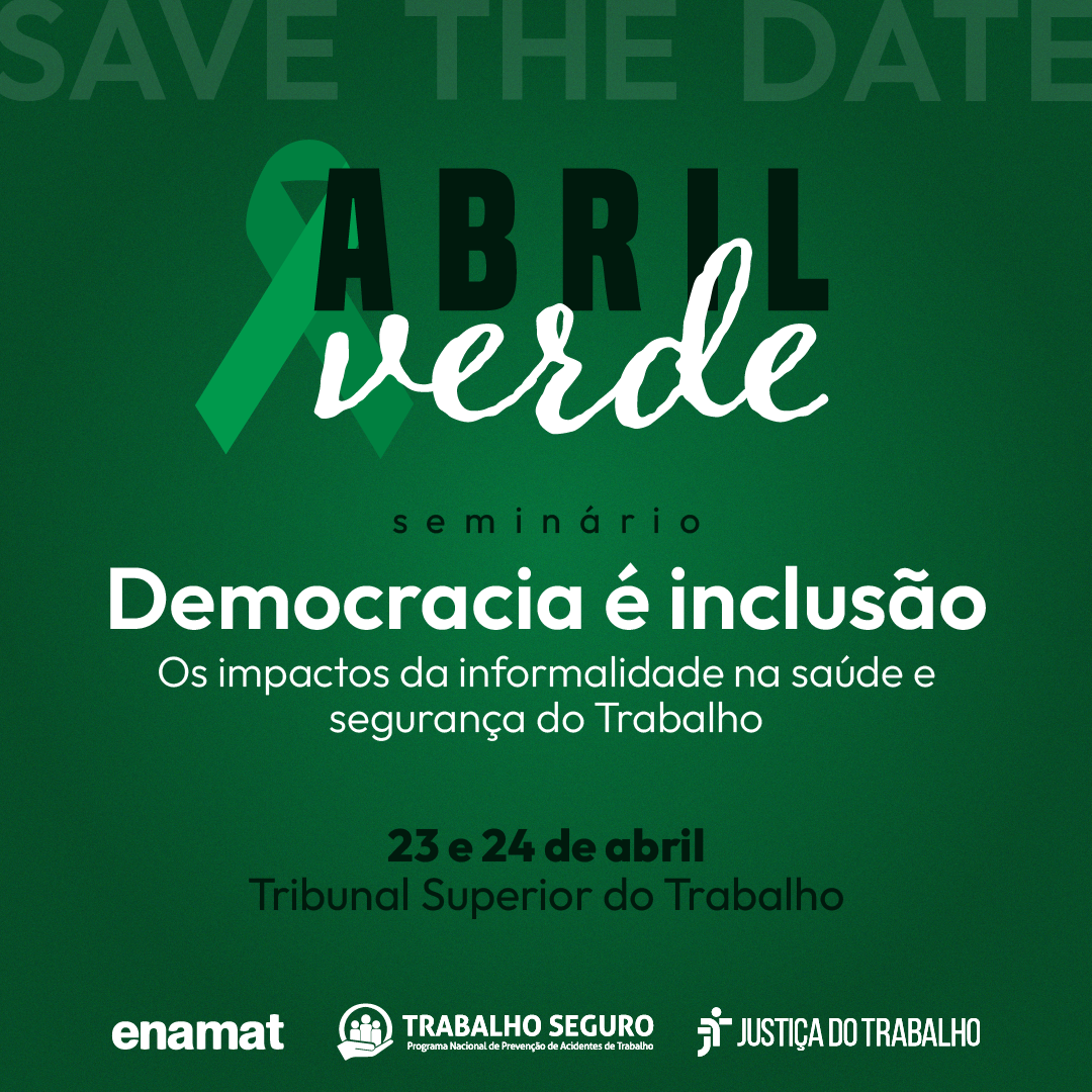 Seminário: O Seminário “Democracia é inclusão: impactos da informalidade na saúde e segurança do trabalho” será realizado nos dias 23 e 24 de abril. O evento tem como público-alvo a magistratura trabalhista, servidoras e servidores, integrantes da advocacia e o público acadêmico e da sociedade em geral. As inscrições serão abertas em breve;