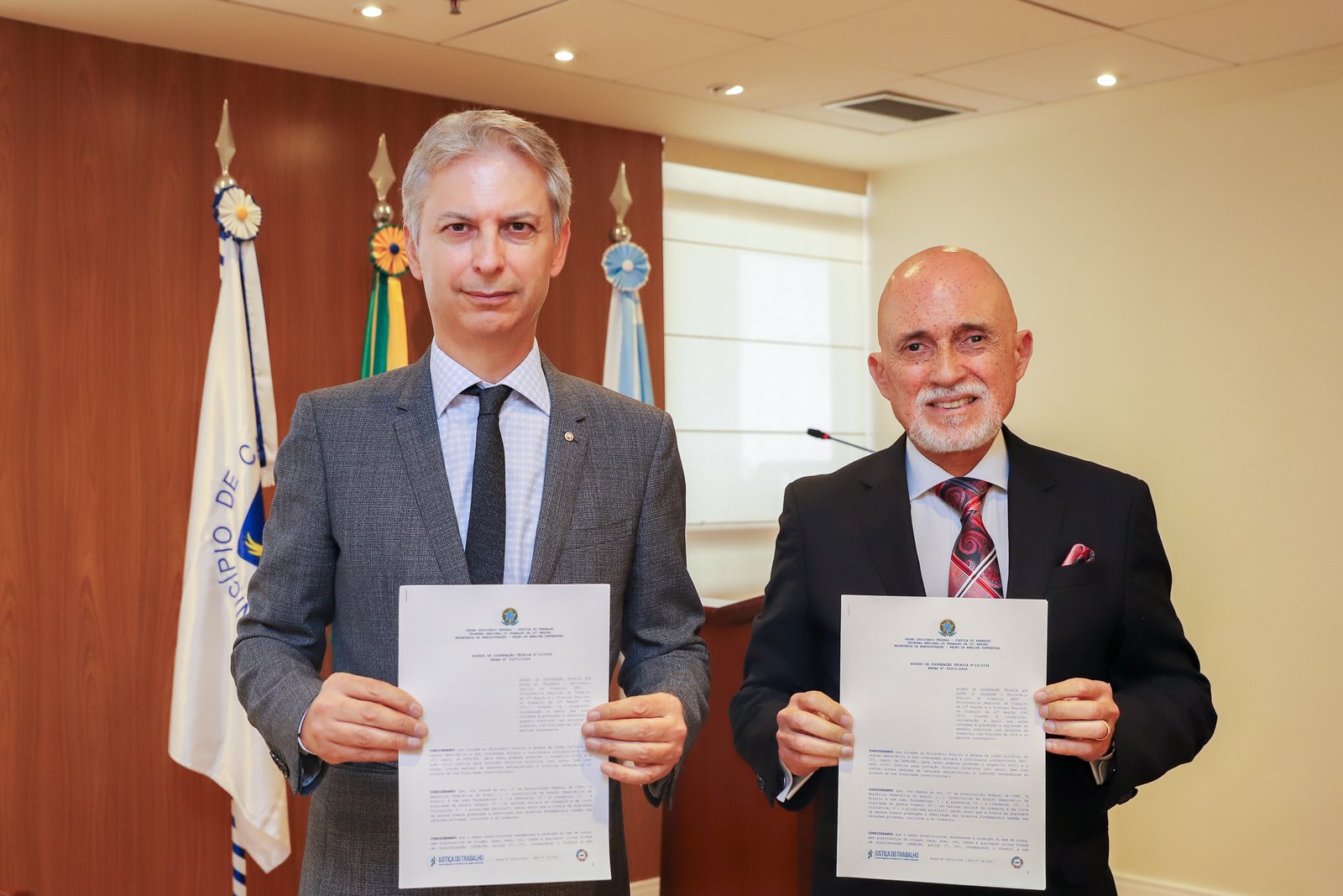 23/09/2024 – O presidente do Tribunal Regional do Trabalho da 15ª Região, desembargador Samuel Hugo Lima, e o procurador-chefe em exercício da Procuradoria Regional do Trabalho da 15ª Região, Ronaldo José de Lira, assinaram na tarde desta segunda-feira, 23/9, o termo de Acordo de Cooperação Técnica 14/2024, que tem por objetivo a integração, coordenação e apoio nas ações do MPT/PRT 15ª e do TRT 15ª, voltadas à prevenção e repressão do assédio eleitoral nas relações de trabalho, nas eleições de 2024 e no período subsequente.